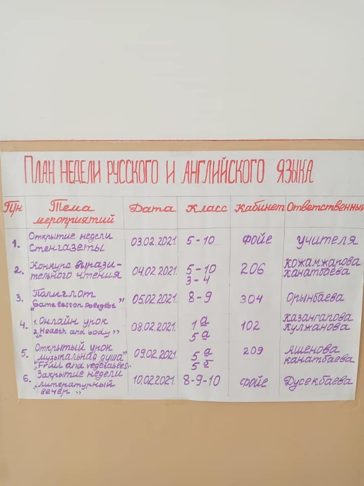 Шымкен қаласы білім басқармасына қарасты №63 жалпы орта мектебінде 3.02. 2021ж күні орыс тілі және агылшын тілі әдістемелік бірлестігінің "Матушка-Зима" тақырыбындағы апталығының ашылуы болып өтті. Апталық 3-10.02.2021ж аралығына жоспарлануда.
