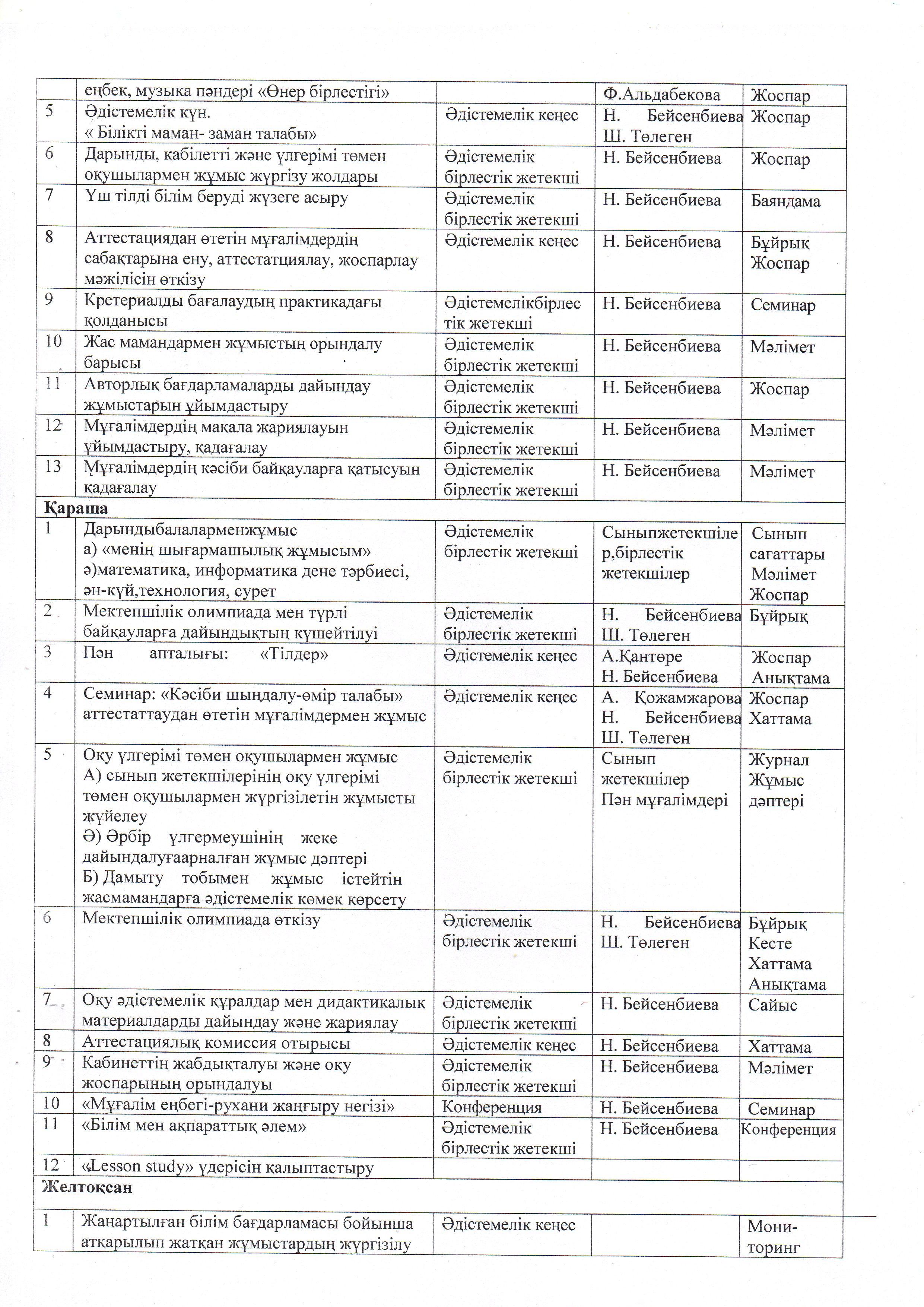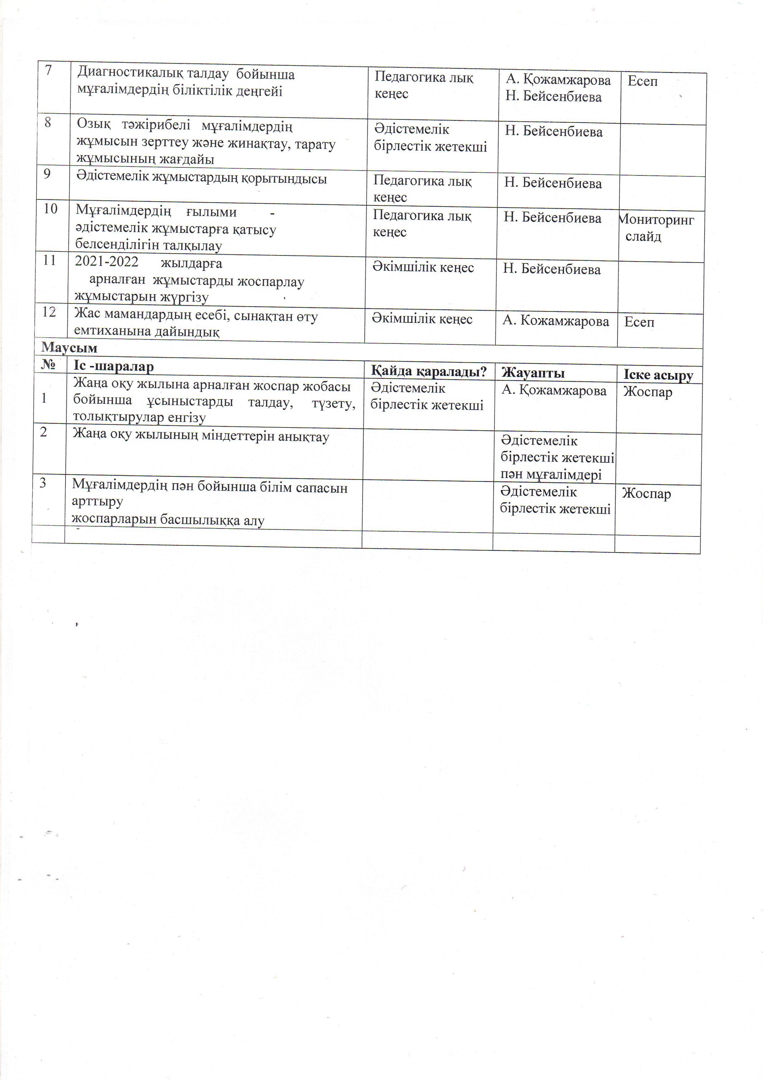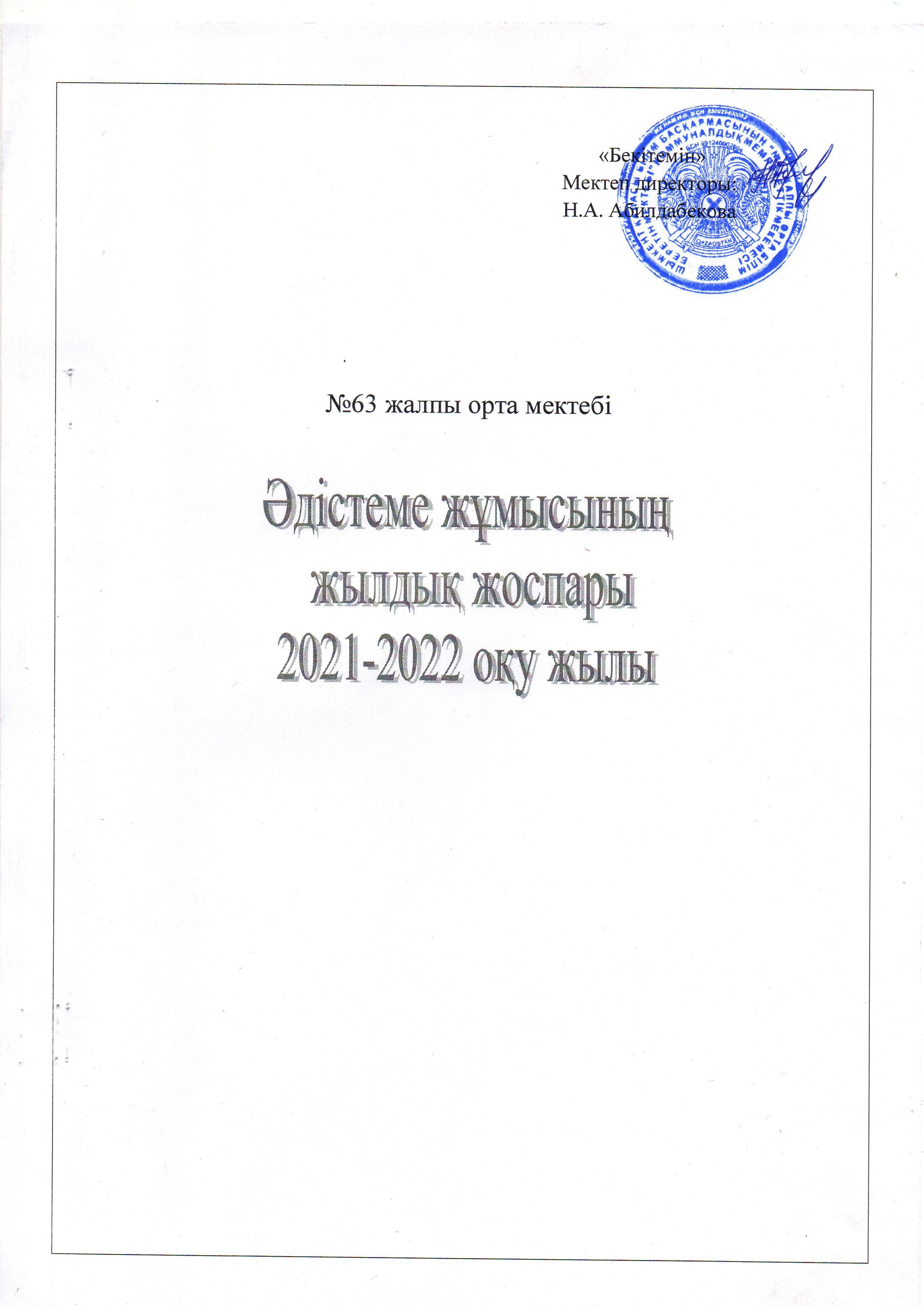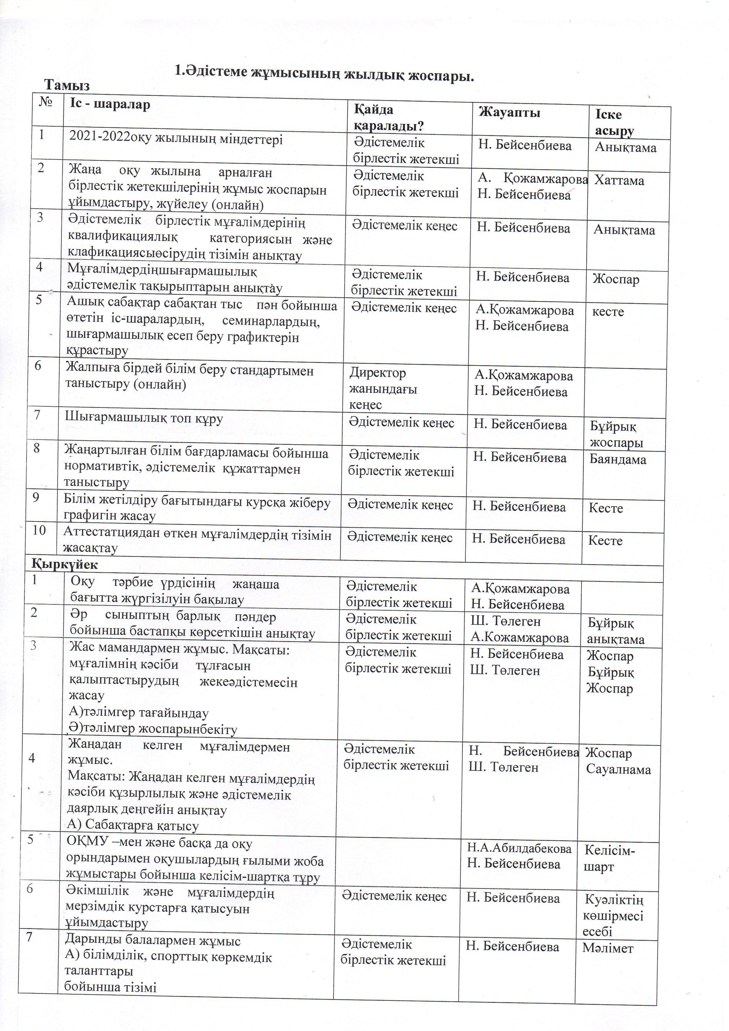 ӘДІСТЕМЕ ЖҰМЫСЫНЫҢ ЖЫЛДЫҚ ЖОСПАРЫ. 2021 - 2022 ОҚУ ЖЫЛЫ