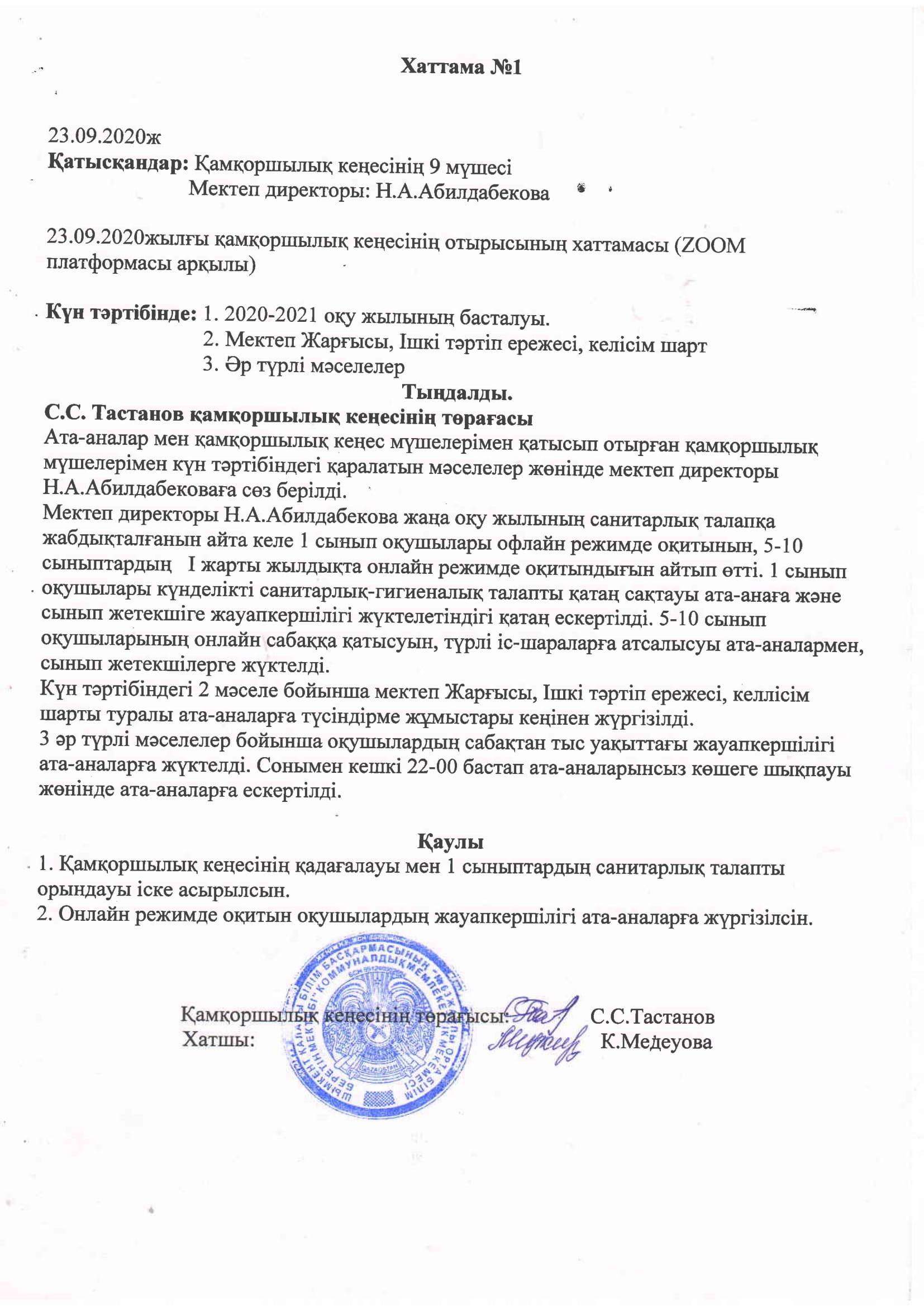 » №63 ЖОМ "Қамқоршылық кеңесінің" ҚАУЛЫСЫ 23.09.2020ж