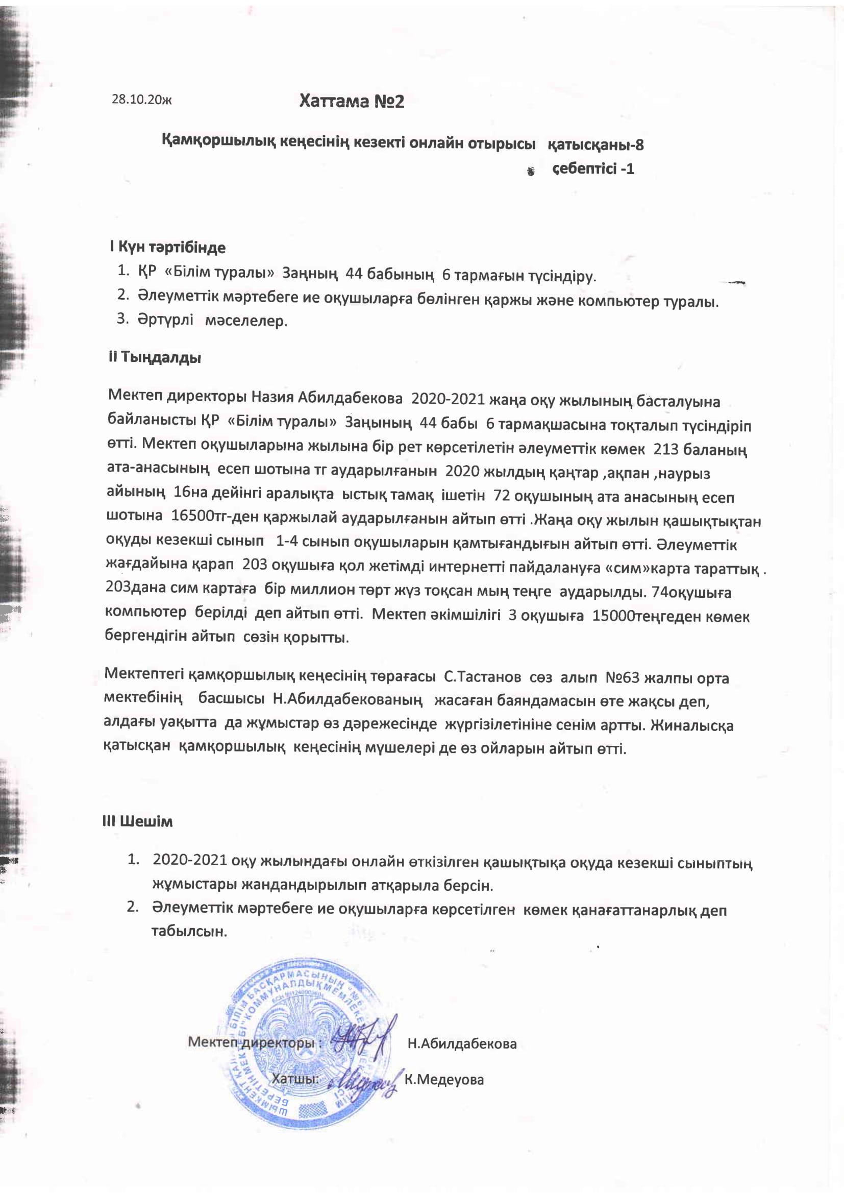 » №63 ЖОМ "Қамқоршылық кеңесінің" ҚАУЛЫСЫ 28.10.2020ж