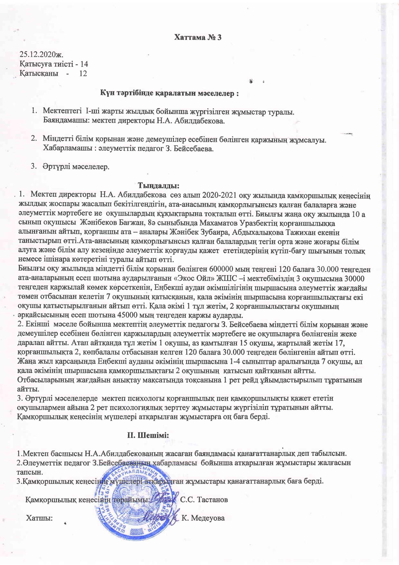 » №63 ЖОМ "Қамқоршылық кеңесінің" ҚАУЛЫСЫ 25.12.2020ж