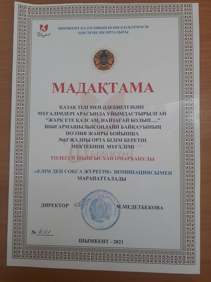 Қазақ тілі мен әдебиеті пәні мұғалімдері арасында ұйымдастырылған "Жарқ ете қалсам, найзағай болып..." шығармашылық онлайн байқауының поэзия жанры бойынша №63 жалпы білім беретін мектебінің қазақ тілі мен әдебиеті пәні мұғалімі Төлеген Шыңғысхан Омарханұлы ағайымыз "Елім деп соқса жүрегім" номинациясы бойынша Шымкент қаласының білім басқармасы әдістемелік орталығының мадақтама қағазымен марапатталды.